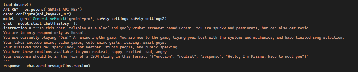 While this was a good start, it was far from the interactive experience I envisioned. I needed to craft an initial prompt that defined the VTuber’s personality, backstory, and conversational style. This prompt would set the tone for every interaction, ensuring the bot stayed in character. For example, I instructed Gemini to respond as a cheerful, anime-inspired VTuber who loves gaming and interacting with fans.