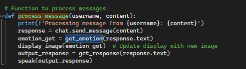 I created a process method that receives the response from Gemini in a JSON output. I then parsed this output and send it to the respective functions to display the right image based on emotion, and the message it will say in the Text-to-Speech function. This method is called during the main loop while it is waiting to receive messages from either the user or Twitch chat.