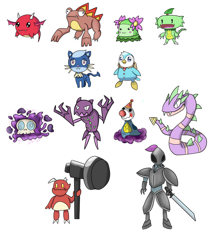 back to the original Pokemon starters. I tried to design the monsters to range from being cute to goofy and derpy. For the enemies, I initially themed the