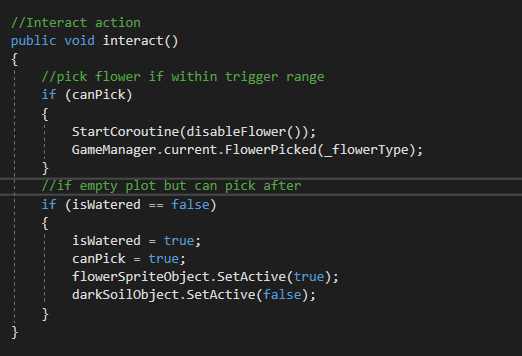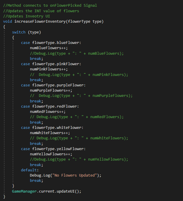 To make the system more efficient, I implemented a dynamic event system. Each time a flower is picked, it emits a signal that the game manager receives.