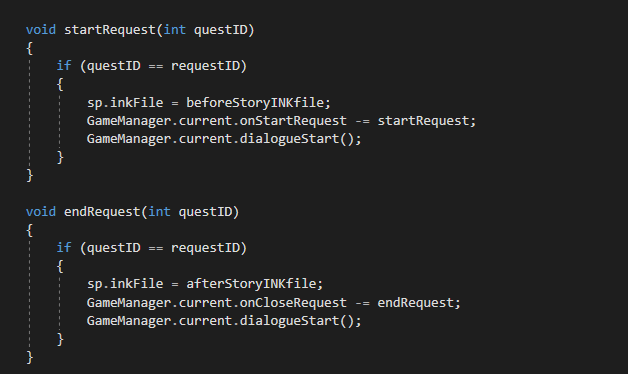 This method also doubles as a test to check if the dialogue system and quests are functioning properly as it allowed me to see if quests