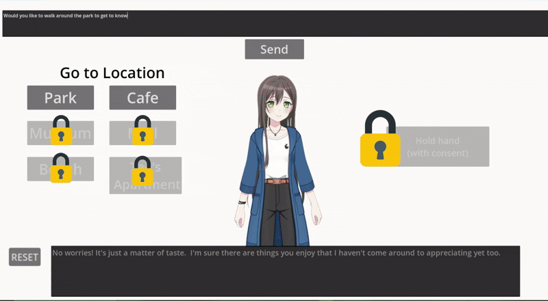 Overview: A 2d text-based dating sim that uses an LLM for a dynamic experience.