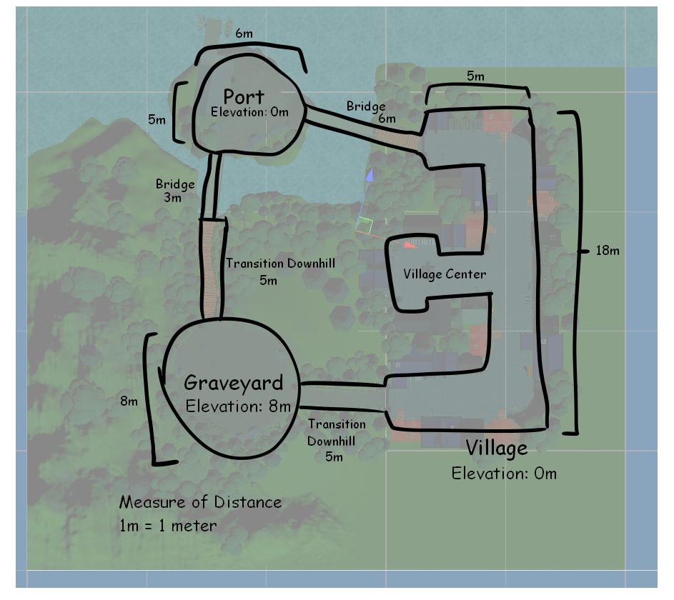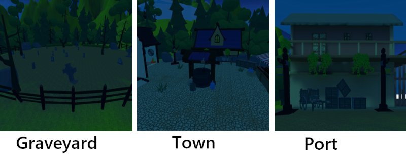 village divided into three main areas: the graveyard, the town, and the port. Each area was designed to offer a unique gameplay experience